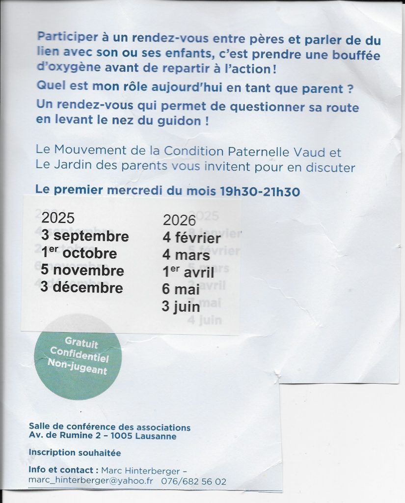 Le MCPV organise à Lausanne des rendez-vous mensuels entre pères pour parler de son rôle aujourd’hui en tant que parent et du lien avec son ou ses enfants. Les rencontres ont lieu de 20h à 22h dans les locaux de l’association, av. de Rumine 2, 1005 Lausanne