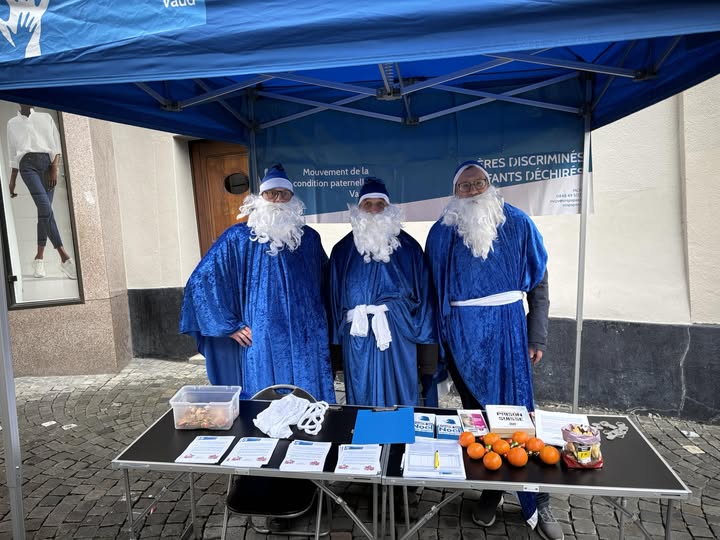 Stand Pères Noël Bleus du MCPV samedi matin 6 décembre à Lausanne. Afin de sensibiliser la population au fait que certains pères ne verront pas leur-s enfant-s à Noël.